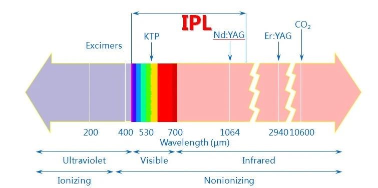 Intense pulsed light does not belong to laser. IPL is a wide-spectrum light formed by focusing and filtering a high-intensity light source. Its spectrum is usually 400-1200nm in the visible light and near-infrared part of the spectrum. The corresponding skin problems are solved by combining different filters. Its main characteristics are: wide spectrum and multiple effects.